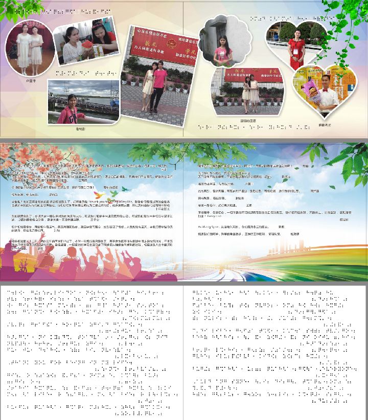 我曾采訪過正在閱讀中的盲人:"雖然一個(gè)個(gè)的盲文點(diǎn)字摸上去澀澀的,但是在我心中它們像是跳動(dòng)的音符。"他們談起閱讀,總是洋溢著別樣的神采。每當(dāng)想起這個(gè)畫面,想起他們?cè)诿の臅先缧砂闾鴦?dòng)的手指以及談話中透露的自信語氣,就更堅(jiān)定我們作為印刷人的初心:?"要將每一件印刷品都賦予生命力,我們需要苛求細(xì)節(jié),不斷追求完美;也只有將每件產(chǎn)品都當(dāng)做藝術(shù)品去雕刻,我們才能自信的把產(chǎn)品呈現(xiàn)給客戶"。正是這種工匠精神的指引,天意有福團(tuán)隊(duì)才能完成可能是國(guó)內(nèi)首批的""盲文畢業(yè)紀(jì)念冊(cè)"。? ? ? ? ? ?? ? ? ? ?
