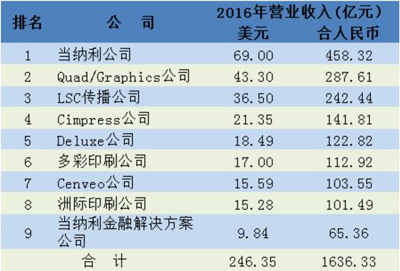 ? ? ? ??中國印刷業(yè)體量與美國相比仍舊差距明顯,盡管這幾年,借助互聯(lián)網(wǎng)與數(shù)字技術(shù),中國印刷業(yè)依舊發(fā)展迅猛,體量逐年遞增。但總的來說,軟、硬實(shí)力相比于北美,仍舊有不小的差距,這是我們需要承認(rèn)的。北美營收規(guī)模最大當(dāng)屬當(dāng)納利,軟實(shí)力也相當(dāng)突出。除了主體當(dāng)納利,還有兩家“當(dāng)納利”系公司:位居第三的LSC傳播公司和位居第九的當(dāng)納利金融解決方案公司。