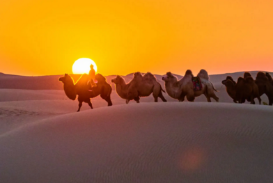 大漠孤煙直,長河落日圓;都不知道過了多久,耳畔響起了陣陣駝鈴的聲音,循聲望去,是駝