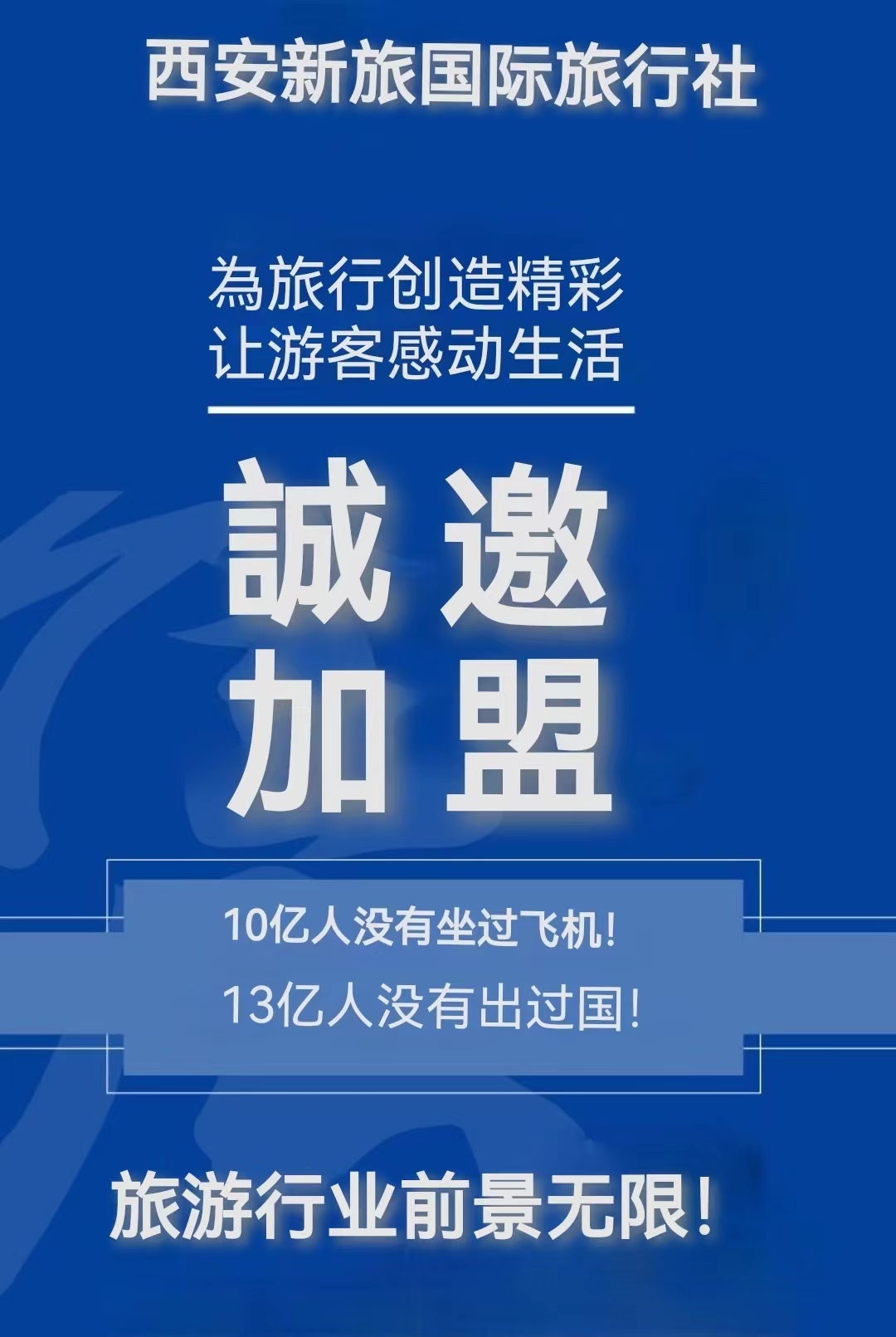 歡迎各地的有識(shí)之士能加盟到我們團(tuán)隊(duì)中來,資源共享、共謀發(fā)展!為旅行創(chuàng)造精彩,讓游客感動(dòng)生活;選擇陜新旅,走遍全世界!
