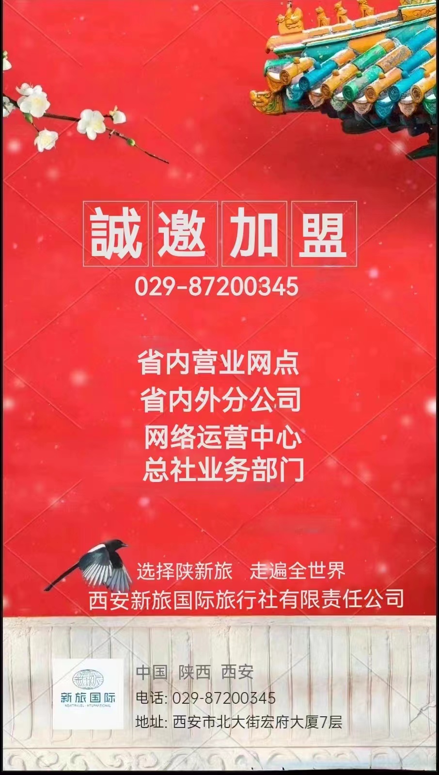 歡迎各地的有識之士能加盟到我們團隊中來,資源共享、共謀發(fā)展!為旅行創(chuàng)造精彩,讓游客感動生活;選擇陜新旅,走遍全世界!